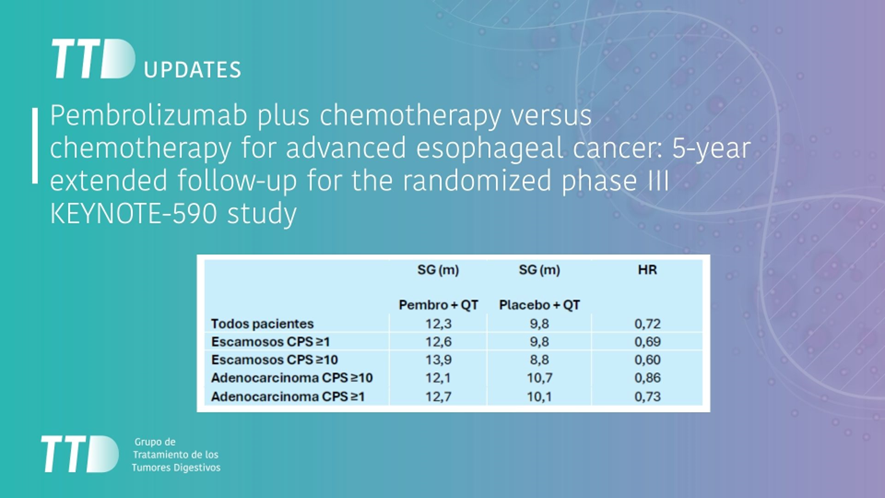 pembrolizumab➕quimioterapia mejora SG vs quimioterapia (12,3vs9,8 meses; HR0,72) y triplica la supervivencia a 5 años (10,6%vs3,0%) en cáncer de esófago avanzado, con perfil de seguridad sin nuevas señales